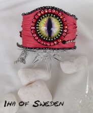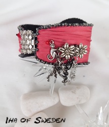 Drakögat ett armband med rött shiborisiden. Shibori är en japansk teknik där man färgar och viker tyget. Här har jag sytt in ögat med svart, rött och svagt grönt. En vacker strasskedja och swarovskikristaller. På sidan metallblommor, flera långa kedjor där det sitter en måne, ett hjärta och en fjäril, på sidan en sittande apa. Låset är ett exklusivt istick från Claspgarten. Sedan har jag fodrat hela armbandet med ett mjukt material. Pris: 950kr, fraktfritt.